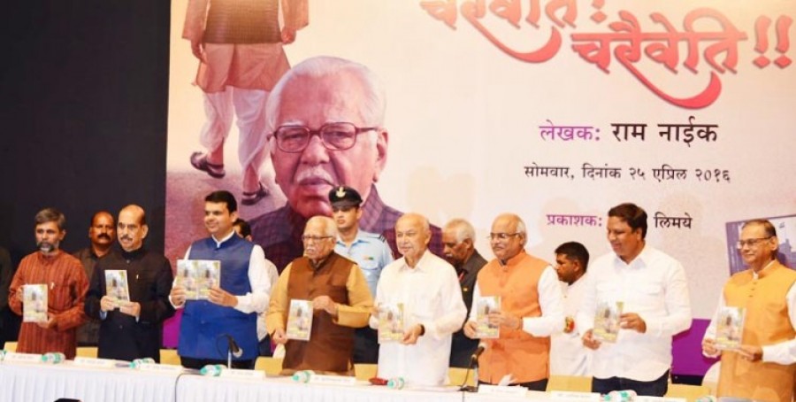 मुंबई। महाराष्ट्र के मुख्यमंत्री देवेंद्र फड़नवीस ने मुंबई के यशवंत राव चव्हाण प्रतिष्ठान में उत्तर प्रदेश के राज्यपाल राम नाईक के मराठी भाषी संस्मरण संग्रह चरैवेती! चरैवेती!! का विमोचन किया। इस अवसर पर लोकसभा के अध्यक्ष एवं महाराष्ट्र के मुख्यमंत्री रहे मनोहर जोशी, मुख्यमंत्री एवं केंद्र्रीय गृहमंत्री रहे सुशील कुमार शिंदे, दैनिक समाचार पत्र सकाळ के समूह संपादक श्रीराम पवार, राज्यपाल राम नाईक के परिजन और गणमान्य नागरिक उपस्थित थे। ज्ञातव्य है कि राज्यपाल के संस्मरण मुंबई के दैनिक समाचार पत्र सकाळ में पाक्षिक रूप से स्तंभ के रूप में निरंतर प्रकाशित होते रहे हैं।