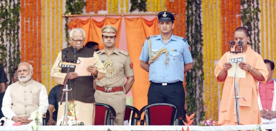 लखनऊ। प्रधानमंत्री नरेंद्र मोदी, भाजपा शासित राज्यों के मुख्यमंत्रियों, भाजपा के वरिष्ठ नेताओं लालकृष्ण आडवाणी, मुरलीमनोहर जोशी, भाजपा अध्यक्ष अमित शाह, केंद्रीय मंत्री वैंकैया नायडू और अन्य केंद्रीय मंत्रियों, समाजवादी पार्टी के संस्थापक अध्यक्ष मुलायम सिंह यादव, समाजवादी पार्टी के राष्ट्रीय अध्यक्ष और कल दोपहर तक उत्तर प्रदेश के मुख्यमंत्री रहे अखिलेश यादव, कांग्रेस के वयोवृद्ध नेता और उत्तर प्रदेश के मुख्यमंत्री रहे नारायणदत्त तिवारी, भाजपा नेताओं और कार्यकताओं के विशाल समूह की मौजूदगी में स्मृति उपवन में गोरक्षपीठाधीश्वर महंत योगी आदित्यनाथ ने 22 कैबिनेट मंत्रियों, 9 स्वतंत्र प्रभार राज्यमंत्रियों तथा 13 राज्यमंत्रियों के साथ उत्तर प्रदेश के मुख्यमंत्री में रूप में पद और गोपनीयता की शपथ ग्रहण की। उत्तर प्रदेश के राज्यपाल राम नाईक ने योगी आदित्यनाथ को प्रदेश का मुख्यमंत्री नियुक्त करते हुए उन्हें पद एवं गोपनीयता की शपथ दिलाई।