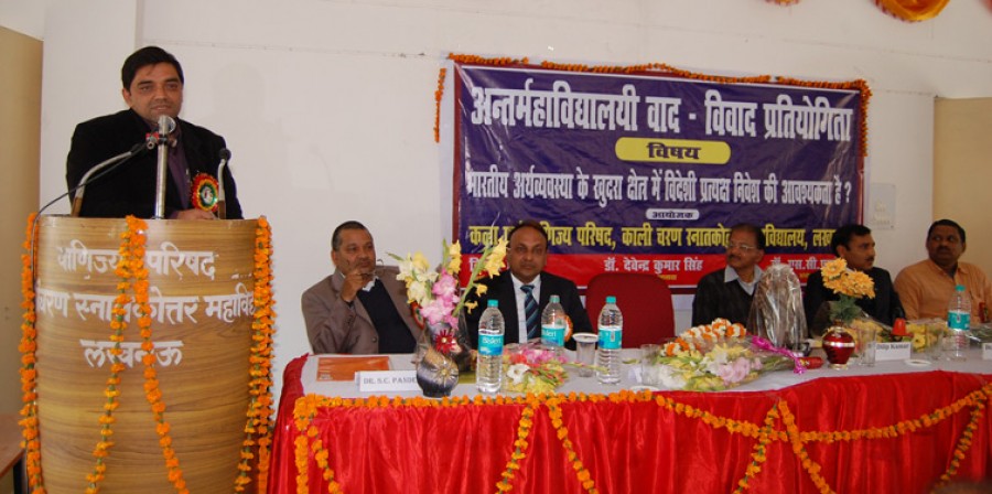 लखनऊ विश्वविद्यालय समाज शास्त्र के प्रोफेसर आरजी यादव ने विशिष्ट अतिथि के उद्बोधन में विभिन्न महाविद्यालयों से आए प्रतिभागियों को सभी क्षेत्रों में गौरव स्थापित करने की प्रेरणा दी। लखनऊ विश्वविद्यालय के व्यवहारिक अर्थशास्त्र विभाग के वरिष्ठ प्रवक्ता डॉ अनूप कुमार सिंह ने इस अवसर पर आयोजित प्रतियोगिता के निर्णायक सदस्य के रूप में कहा कि एफ़डीआई के सकारात्मक एवं नकारात्मक पक्षों पर मंथन के बाद ही एक पूर्व निश्चित क्रम में भारतीय परिवेश के अनुसार प्राथमिकता मिलनी चाहिए।महाविद्यालय के प्राचार्य डॉ देवेंद्र कुमार सिंह ने धन्यवाद ज्ञापित किया एवं विश्वविद्यालय सहित विभिन्न महाविद्यालयों के प्रतिभागियों में विजयी एवं सहभागिता करने वाले छात्र-छात्राओं को बधाई दी। दो दिवसीय कार्यक्रमों में लखनऊ विश्वविद्यालय सहित 30 महाविद्यालयों के 200 से अधिक छात्र-छात्राओं ने अपनी सहभागिता की।