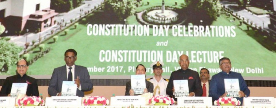 रामनाथ कोविद ने कहा कि समाज के निचले स्तर पर संविधान के मूल्यों और सामाजिक, आर्थिक तथा राजनीतिक विकास के परिणामों के प्रति बुनियादी वचनबद्धता अवश्य जारी रहनी चाहिए। उन्होंने कहा कि इसके लिए यह जरूरी है कि हम अधीनस्थ संस्थानों को सभी क्षेत्रों में शीर्ष स्थानों के समकक्ष लाने के लिए निरंतर प्रयास करें। कार्यक्रम में राष्ट्रपति रामनाथ कोविद को भारत के प्रधान न्यायधीश न्यायमूर्ति दीपक मिश्रा ने दो पुस्तकों ‘द कांस्टिट्यूशन एट 67’ और ‘इंडियन ज्यूडिशियरीः एनुअल रिपोर्ट 2016-17’ की प्रथम प्रतियां भेंट कीं। गौरतलब है कि संविधान दिवस पर देश के और हिस्सों में भी अनेक कार्यक्रम आयोजित किए गए, जिनमें संविधान निर्माता बाबासाहब डॉ भीमराव अंबेडकर को विभिन्न तरीके से विनम्र श्रद्धांजलि अर्पित की गईं।