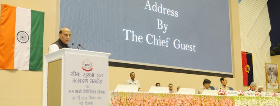 गृहमंत्री राजनाथ सिंह ने कहा कि वह बीएसएफ को सुरक्षा की पहली पंक्ति के रूपमें नहीं, बल्कि हमारी सुरक्षा की पहली दीवार के रूपमें बुलाएंगे। सीमाओं का बचाव करने में बीएसएफ की भूमिका को रेखांकित करते हुए उन्होंने कहा कि अपनी सीमाओं की रक्षा करना हमारी ज़िम्मेदारी है, लेकिन जिम्मेदारियों की कोई सीमा नहीं है। उन्होंने सीमाओं पर तस्करी और नकली नोटों की रोकथाम के लिए बीएसएफ की सराहना की। गृहमंत्री ने बताया कि भारत सरकार सशस्त्र बलों में युद्ध दुर्घटनाओं की तर्ज पर अर्धसैनिक बलों को 'परिचालन दुर्घटना प्रमाण पत्र' देने पर विचार कर रही है, जिसका लाभ उन सीएपीएफ जवानों के परिवारों को मिलेगा, जो सीमावर्ती संघर्ष या आतंकवाद से मुकाबला करने के दौरान मारे जाते हैं। राजनाथ सिंह ने नागरिकों के लिए बीएसएफ के कार्यक्रमों की सराहना की। उन्होंने यह भी बताया कि सीएपीएफकर्मियों की शिकायतों का समाधान करने के लिए एक वेबपोर्टल शुरू किया गया है। बीएसएफ के महानिदेशक केके शर्मा भी अलंकरण समारोह में मौजूद थे। उन्होंने कहा कि बीएसएफ जवान राष्ट्र की सुरक्षा में सर्वोच्च बलिदान के लिए हरपल तैयार हैं। उन्होंने कहा कि बीएसएफ अपनी सामाजिक जिम्मेदारियों का भी निर्वहन कर रहा है।