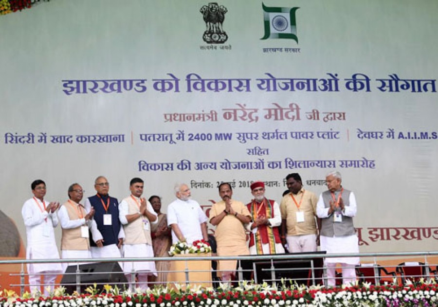 सिंदरी (झारखंड)। प्रधानमंत्री नरेंद्र मोदी ने सिंदरी में एक समारोह में भारत सरकार और झारखंड सरकार की कई विकास परियोजनाओं का शिलान्यास किया। इनमें हिंदुस्तान उर्वरक और रसयान लिमिटेड के सिंदरी उर्वरक परियोजना का पुर्नरुद्धार, गेल की रांची सिटी गैस वितरण परियोजना, अखिल भारतीय आयुर्विज्ञान संस्थान देवघर, देवघर हवाईअड्डे का विकास और पतरातू सुपर थर्मल पावर परियोजना प्रमुख हैं। प्रधानमंत्री की उपस्थिति में जन औषाधि केंद्रों के लिए सहमति पत्रों का आदान-प्रदान भी किया गया। प्रधानमंत्री नरेंद्र मोदी ने एक जनसभा में आदिवासी जननायक बिरसा मुंडा को श्रद्धांजलि अर्पित की। उन्होंने कहा कि केंद्र और राज्य सरकार झारखंड के तीव्र विकास के लिए मिलकर काम कर रहे हैं। उन्होंने कहा कि 27,000 करोड़ रुपये की इन विकास परियोजनाओं से झारखंड के युवाओं को अवसर प्राप्त होंगे।