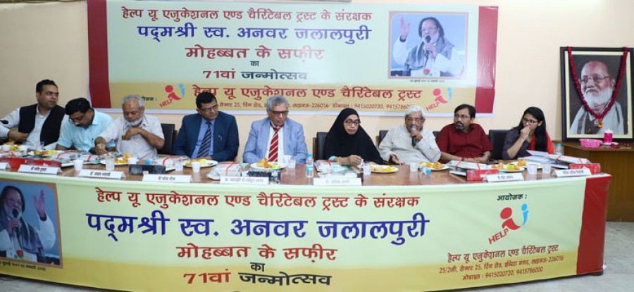 लखनऊ। साहित्यकार एवं शायर और हेल्प यू एजुकेशनल एंड चैरिटेबल ट्रस्ट के संरक्षक रहे पद्मश्री अनवर जलालपुरी के 71वें जन्मदिन पर उनकी याद में चैरिटेबल ट्रस्ट ने 'शायरी और दानिश्वरी का संगम : अनवर जलालपुरी' विषय पर उत्तर प्रदेश हिंदी संस्थान परिसर के निराला सभागार लखनऊ में एक संगोष्ठी का आयोजन किया। संगोष्ठी में इलाहाबाद उच्च न्यायालय की लखनऊ पीठ के न्यायमूर्ति शबीहुल हसनैन मुख्य अतिथि के रूप में शामिल हुए। उन्होंने इस अवसर पर कहा कि अनवर जलालपुरी क़ौमी एकता के अलमबरदार थे, उनके अंदर मानवीय हमदर्दियां कूट-कूट कर भरी थीं, वे राष्ट्रवाद एवं भाषाई एकता के पक्षधर थे। उन्होंने कहा कि अनवर जलालपुरी की शायरी में जगह-जगह इंसानियत की हिफाज़त और भाईचारे का पैग़ाम मिलता है तो राष्ट्र की एकता और अखंडता को कायम रखने की भरपूर कोशिश भी नज़र आती है, ज़नाब अनवर साहब में यह भावना कूट-कूट कर भरी थी।