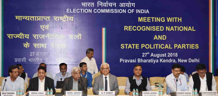 नई दिल्ली। भारत निर्वाचन आयोग ने बताया है कि चुनाव वाले राज्यों को छोड़कर 1 सितम्बर से सभी राज्यों में मतदाता पुनरीक्षण का कार्य प्रारंभ होगा और यह एक महीने के बजाय दो महीने तक जारी रहेगा। निर्वाचन आयोग ने कल चुनाव से संबंधित विभिन्न मुद्दों के संदर्भ में सभी राष्ट्रीय और राज्यस्तरीय राजनीतिक दलों की बैठक की थी, जिसमें 7 राष्ट्रीय दलों और 34 राज्यस्तरीय दलों ने भाग लिया। मुख्य निर्वाचन आयुक्त ओपी रावत ने बैठक के बाद यह जानकारी देते हुए बताया कि कुछ राजनैतिक दलों ने आयोग से अनुरोध किया कि ईवीएम पर भरोसा बढ़ाने के लिए एक निश्चित प्रतिशत की मात्रा में वीवीपीएटी रसीद की व्यवस्था की जाए। राजनीतिक दलों ने आग्रह किया कि बेहतर मतदाता सूची प्रबंधन के लिए मतदाताओं के ब्यौरे में आधार नम्बर को जोड़ा जाना चाहिए। राजनैतिक दलों ने पेड न्यूज़ पर चिंता जताई और कहा कि इसपर नियंत्रण के लिए इसे चुनावी अपराध घोषित किया जाना चाहिए। मतदान में भागीदारी सहित पहुंच बढ़ाने और व्यापक आधार को प्रोत्साहित करने के आयोग के प्रयासों के संबंध में राजनैतिक दलों के विचार और फीडबैक आमंत्रित किए गए हैं।