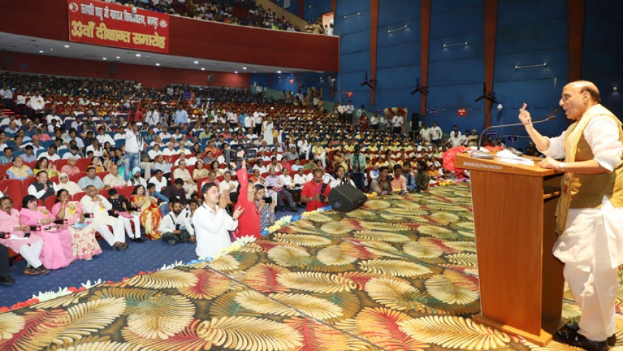 गृहमंत्री राजनाथ सिंह ने दीक्षांत समारोह में अपने विचारों के प्रकटीकरण से खूब भावनाप्रधान सम्मान अर्जित किया। उन्होंने छात्र-छात्राओं के जीवन से संबंधित हर पक्ष को छुआ और हर पक्ष में उज्जवल भविष्य का एक संदेश था। उन्होंने भारतीय प्रतिभाओं की जमकर तारीफ की, उनका उत्साह बढ़ाया और उन्हें देश और समाज के विकास के उच्च मूल्यों की प्रगति के लिए निरंतर प्रगतिशील रहने को प्रोत्साहित किया। उन्होंने कहा कि टेक्नोलाजी का युग है, जिसमें इंटरनेट से भी शिक्षा प्राप्त की जा सकती है, लेकिन संस्कार इंटरनेट नहीं दे सकता, संस्कार यदि कोई दे सकता है तो केवल आपका गुरु ही दे सकता है। राजनाथ सिंह ने कहा कि डिग्री हासिल करने के बाद हर युवक और युवती की हसरत एक शानदार कैरियर हासिल करने की होती है, नौकरी मिलने के बाद एक शानदार पैकेज की भी चाह होती है, यह स्वाभाविक है, लेकिन उन्होंने प्रश्न किया कि क्या जीवन में शानदार पैकेज हासिल करना ही जीवन का उद्देश्य होना चाहिए? छात्रों के सम्मुख ज्ञान और उसकी उपयोगिता का एक ज्वलंत उदाहरण रखते हुए राजनाथ सिंह ने कहा कि वे 11 सितंबर 2001 को याद करें, इसी तारीख में अमेरिका में हवाई जहाज उड़ाने वाले पायलट्स ने, जिन्हें अच्छी डिग्री हासिल थी और जिन्हें वेतन का बड़ा अच्छा पैकेज भी हासिल हो रहा था, अमेरिका के वर्ल्ड ट्रेड सेंटर से हवाई जहाज टकराकर हजारों लोगों की जान लेने का काम किया। राजनाथ सिंह ने कहा कि सब कुछ था उनके पास, इसलिए मनुष्य के जीवन का लक्ष्य केवल ज्ञान नहीं हो सकता, ज्ञान के अतिरिक्त हमें संस्कार भी चाहिएं, मन के अच्छे भाव चाहिएं, जीवन के जो श्रेष्ठ मूल्य होते हैं, उन मूल्यों के प्रति हमारी प्रतिबद्धता होनी चाहिए।