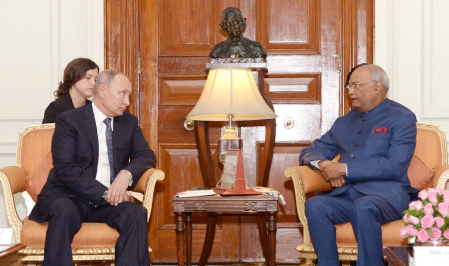 नई दिल्ली। रूस के राष्ट्रपति व्लादीमीर पुतिन ने राष्ट्रपति रामनाथ कोविंद से राष्ट्रपति भवन दिल्ली में भेंट की। राष्ट्रपति रामनाथ कोविंद ने रूसी राष्ट्रपति का स्वागत करते हुए कहा कि भारत और रूस के बीच मैत्रीपूर्ण संबंध और भी मजबूती के साथ आगे बढ़ रहे हैं। उन्होंने कहा कि 19वीं वार्षिक द्विपक्षीय शिखर बैठक सफल रही है, हमारे संबंधों के लिए यह वर्ष उपयोगी रहा है एवं महत्वपूर्ण उपलब्धियां प्राप्त की गई हैं। राष्ट्रपति रामनाथ कोविंद ने कहा कि भारत-रूस विशेष और सम्मानित रणनीतिक साझेदारी में व्लादीमीर पुतिन के व्यक्तिगत योगदान की गंभीरता से सराहना करता है।
