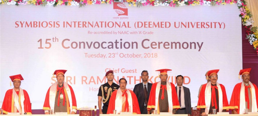राष्ट्रपति रामनाथ कोविंद ने कहा कि भारत में 903 विश्वविद्यालय और 39050 कॉलेज का व्यापक नेटवर्क है और आज के आधुनिक दौर में भी हमारे विश्वविद्यालय कई देशों खासकर पड़ोसी देशों और अफ्रीका जैसे महाद्वीप के प्रतिभावान युवाओं के लिए खुले हैं, जिनके साथ हमारे विशेष संबंध रहे हैं। उन्होंने कहा कि यह उल्लेखनीय है कि 146 देशों से आए 46,144 विदेशी छात्र देश के विभिन्न कॉलेजों और विश्वविद्यालयों में शिक्षा ले रहे हैं, इसमें सिम्बायोसिस बड़ी भूमिका निभा रहा है। राष्ट्रपति ने कहा कि उन्हें इस बात की खुशी है कि सिम्बायोसिस में 1000 से ज्यादा विदेशी छात्र पढ़ रहे हैं, यहां से स्नातक बनकर निकलने वाले छात्रों में से 329 भारत के अलावा 33 अन्य देशों से हैं। उन्होंने कहा कि यह सिम्बायोसिस को विविध संस्कृति और विभिन्न महानगरों की जीवनशैली से जुड़ा माहौल प्रदान करता है, जो विभिन्न देशों के बीच सौहार्द को बढ़ावा दे रहा है। दीक्षांत समारोह में सिम्बायोसिस के प्रशासनिक अधिकारी, प्रोफेसर और पूर्व छात्र भी उपस्थित थे।