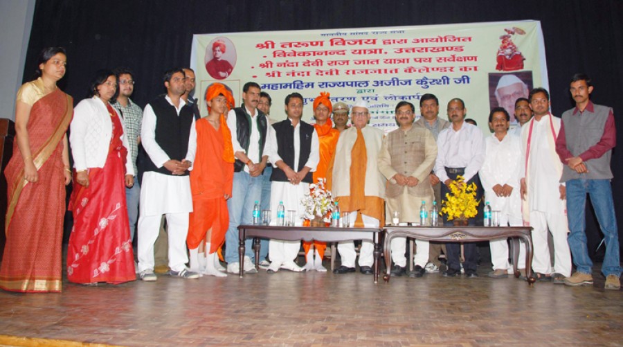 देहरादून। उत्तराखंड के राज्यपाल डॉ अज़ीज़ कुरैशी ने राजभवन में विवेकानंद यात्रा उत्तराखंड, नंदा देवी राजजात यात्रा पथ सर्वेक्षण, नंदा देवी राजजात कलेंडर 2013 का शुभावतरण तथा लोकार्पण किया। यह कार्यक्रम राज्यसभा सांसद एवं नंदा राजजात पूर्व पीठिका समिति उत्तराखंड के अध्यक्ष तरूण विजय ने आयोजित किया था। समिति के अध्यक्ष की ओर से समिति के संरक्षक बनने का अनुरोध सहर्ष स्वीकारते हुए राज्यपाल ने कहा कि हजारों लोगों की श्रद्धा व आस्था से जुड़ी 280 किलोमीटर लंबी 19 दिन की इस कठिन आध्यात्मिक यात्रा की सफलता के लिए वे हर संभव सहयोग करेंगे। राज्यपाल ने समिति के सरंक्षक की हैसियत से कार्यक्रम के आयोजकों को आश्वस्त किया कि इस यात्रा की कठिनाईयों को न्यूनतम करने के लिए सभी अपेक्षित व्यवस्थाओं हेतु वे स्वयं शीर्ष प्राथमिकता पर केंद्र सरकार से समन्वय स्थापित करेंगे।