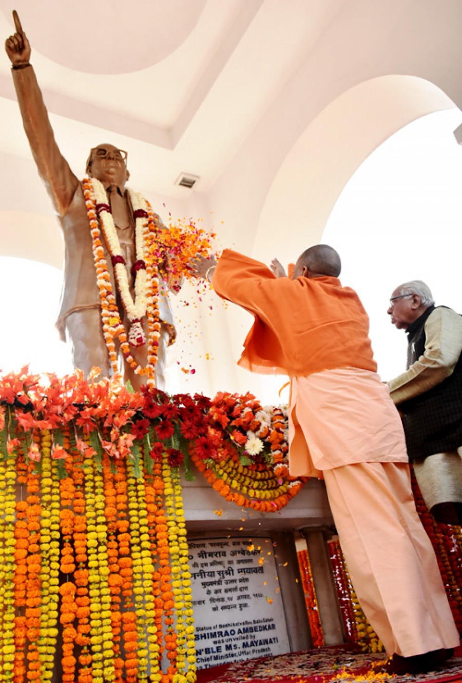 मुख्यमंत्री योगी आदित्यनाथ ने भी विचार व्यक्त करते हुए कहा कि बाबासाहेब डॉ भीमराव आंबेडकर ऐसे महामानव थे, जिन्होंने समतामूलक समाज के निर्माण तथा दबे-कुचले एवं वंचित समाज को सत्ता में आगे बढ़ाने का काम किया। उन्होंने कहा कि प्रधानमंत्री नरेंद्र मोदी ने बाबासाहेब से जुडे़ 5 स्थानों को पंचशील के रूपमें विकसित किया है। मुख्यमंत्री ने इस मौके पर यह भी जानकारी दी कि अनुसूचित जाति एवं जनजाति के छात्रों को छात्रवृत्ति की पहली किस्त भेजी जा चुकी है तथा अगली किस्त 26 जनवरी के पहले भेज दी जाएगी, नई योजना के तहत राशन कार्ड भी उपलब्ध कराए जाएंगे तथा विधवाओं की पेंशन हेतु स्वीकृतियां भी दे दी गई हैं। उन्होंने कहा कि आर्थिक विषमता को दूर करने एवं स्वरोज़गार उपलब्ध कराने की दृष्टि से अनेक योजनाएं लागू की जा रही हैं। कार्यक्रम में आंबेडकर महासभा के राष्ट्रीय अध्यक्ष तथा उत्तर प्रदेश अनसूचित जाति-जनजाति एवं वित्त विकासनिगम के अध्यक्ष लालजी निर्मल ने भी विचार व्यक्त किए। कार्यक्रम में मंत्री स्वामी प्रसाद मौर्य, रीता बहुगुणा जोशी, लखनऊ की महापौर संयुक्ता भाटिया और गणमान्य नागरिक उपस्थित थे।