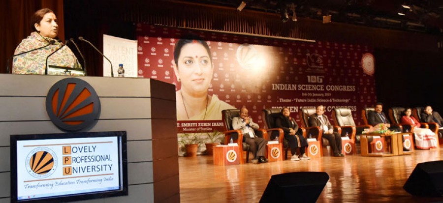 जालंधर। केंद्रीय कपड़ा मंत्री स्मृति जुबिन इरानी ने जालंधर के लवली प्रोफेशनल विश्वविद्यालय में भारतीय विज्ञान कांग्रेस 2019 के एक हिस्से के रूपमें महिला विज्ञान कांग्रेस का उद्घाटन किया, जिसका उद्देश्य विज्ञान, प्रौद्योगिकी और समाज में महिलाओं के योगदान को प्रदर्शित करना है। स्मृति इरानी ने कहा कि विज्ञान जेंडर तटस्थ है। उन्होंने उल्लेख किया कि देशभर के अनुसंधान और विकास संस्थानों में कार्यरत लगभग 2.8 लाख वैज्ञानिकों, इंजीनियरों में केवल 39,000 महिलाएं हैं, जो महिला वैज्ञानिक समुदाय को देश में सबसे विशाल अल्पसंख्यक बनाता है। स्मृति इरानी ने कहा कि आंकड़ों से प्रदर्शित होता है कि विज्ञान, प्रौद्योगिकी, इंजीनियरिंग और गणित क्षेत्र में 81 प्रतिशत महिलाएं हैं, प्रदर्शन मूल्यांकन में एक जेंडर पूर्वाग्रह है। उन्होंने कहा कि यह पता लगाने की जरूरत है कि हमारे देश में, हमारे समुदाय में कितनी महिलाएं पेटेंट फाइल करती हैं और हमारे समुदाय एवं हमारे शिक्षण संस्थानों में कितनी महिलाओं को सिखाया जाता है कि वे किस प्रकार अपने नवाचारों एवं आविष्कारों का व्यवसायीकरण करें। महिला विज्ञान कांग्रेस की विषयवस्तु फ्यूचर इंडिया: साइंस एंड टेक्नोलॉजी थी।