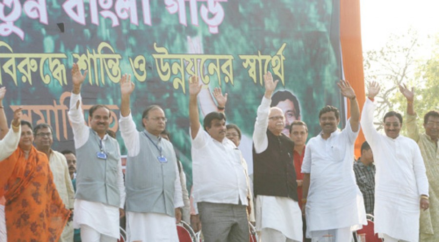 आडवाणी ने कहा यह गंभीर बात है कि प्रधानमंत्री को टूजी स्पेक्ट्रम मामले में सुप्रीम कोर्ट में हलफनामा देना पड़ा है। टेलीफोन टेपिंग का भी उन्होंने जिक्र किया और कहा कि राजनेताओं के टेलीफोन गृहमंत्रालय की इज़ाजत के बगैर टेप नहीं किए जा सकते हैं। उन्होंने ये भी कहा कि भाजपा शासित राज्यों की सरकारें भ्रष्टाचार से मुक्त हैं। आडवाणी ने कम्युनिस्ट पार्टी और कांग्रेस के साथ तृणमूल कांग्रेस की अध्यक्ष ममता बनर्जी को भी निशाना बनाया और यह कहा कि इस तरह की पार्टियां अपनी सुविधा के लिए इधर-उधर जाती रहती हैं। उन्होंने विश्वास व्यक्त किया कि पश्चिम बंगाल में इस बार चुनाव में माकपा सत्ता से बाहर हो जाएगी। भाजपा अध्यक्ष नितिन गडकरी ने भी कांग्रेस को ही लपेटा। भाजपा के वरिष्ठ नेता विदेशी काले धन पर बोले और भाजपा नेता अरूण जेटली ने माओवादियों और मार्क्सवादियों को एक ही श्रेणी में रखा।