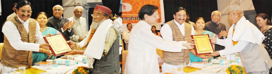 देहरादून। मुख्यमंत्री रमेश पोखरियाल निशंक ने शनिवार को ओएनजीसी के एएमएन घोष सभागार में उत्तराखंड भाषा संस्थान के लोक भाषा सम्मेलन में राज्य के वरिष्ठ साहित्यकारों को सम्मानित किया। सम्मेलन में महत्तर सम्मान से डॉ देवी दत्त शर्मा एवं डॉ हरिदत्त भट्ट 'शैलेष' को, गुमानी पंत सम्मान से शिवराज सिंह रावत ‘निसंग’ एवं शेर सिंह पांगती को, मौलाराम सम्मान से डॉ शिव प्रसाद भारद्वाज, प्रोफेसर विष्णु दत्त ‘राकेश’, कैलाश चंद्र लोहानी को, पीतांबर दत्त बड़थ्वाल सम्मान से हर्ष पर्वतीय, शेर सिंह मेहता ‘कुमाऊंनी’ को और डॉ गोविंद चातक सम्मान से भगवती प्रसाद नौटियाल, डॉ अचलानंद जखमोला, मथुरा दत्त मठपाल, डॉ जग्गू नौडियाल, वीणा पाणि जोशी, गोपाल दत्त भट्ट, बिहारी लाल दनोशी, डॉ मधुबाला नयाल, डॉ देव सिंह पोखरिया, डॉ शेर सिंह बिष्ट, भारती पांडे, केशव चंद्र सकलानी, नंद किशोर हटवाल, मदन मोहन डुकलान एवं दिनेश चमोला को सम्मानित किया गया।