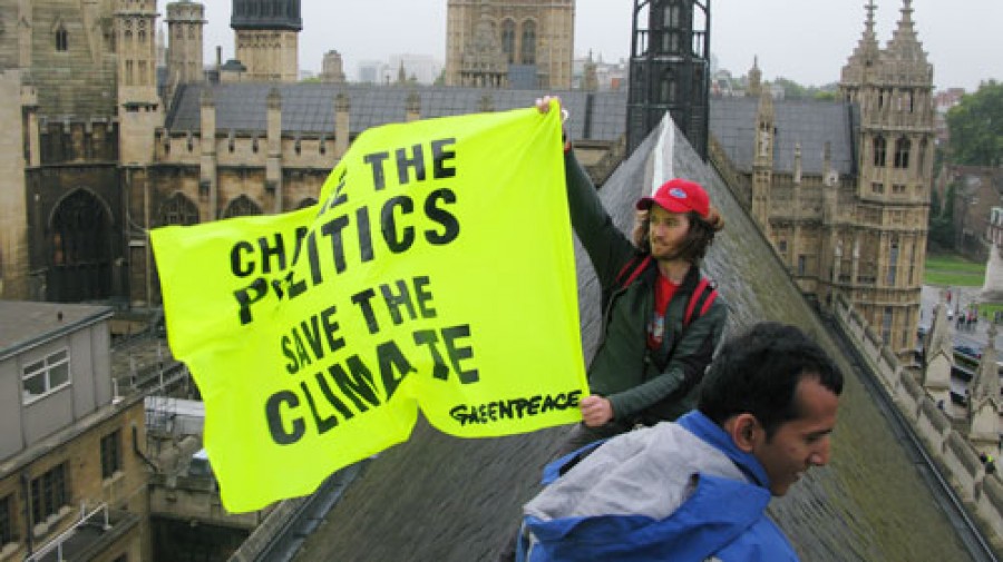 गौरतलब है कि ग्रीनपीस के 51 कार्यकर्ता जलवायु परिवर्तन की चुनौती का सामना करने में सक्षम राजनीति की मांग को लेकर ब्रिटिश हाऊस आफ पार्लियामेंट की ऐतिहासिक दीवार पर चढ़े थे। इनमें से 24 रात आठ बजे नीचे उतर आए पर 31 अब निचली छत पर हैं। उन्होंने ग्रेट हाल की छत पर एक बड़ा सा बैनर टांग रखा है जिसपर लिखा है ?राजनीति में बदलाव लाओ, जलवायु बचाओ।? उन्होंने इसके लिए 12 सरल उपाय सुझाये हैं जिनसे यूके अपने कार्बन उत्सर्जन में कमी ला सकता है और विकासशील देशों को हरित स्वच्छ तकनीक अपनाने में मदद कर सकता है।