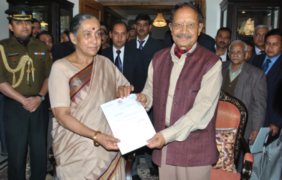 देहरादून। उत्तराखंड की राज्यपाल मार्गेट आल्वा ने बुधवार को मुख्यमंत्री भुवन चंद्र खंडूड़ी का त्यागपत्र स्वीकार करते हुए उनसे नये मुख्यमंत्री के शपथ ग्रहण करने तक कार्यवाहक मुख्यमंत्री बने रहने का अनुरोध किया है। खंडूड़ी ने बुधवार को सायं 5.30 बजे, रूद्रपुर विधान सभा क्षेत्र से नवनिर्वाचित विधायक राजकुमार ठुकराल के साथ राजभवन पहुंचकर राज्यपाल से मुलाकात की तथा उन्हें मुख्यमंत्री पद से अपना त्यागपत्र सौंपा। राज्यपाल ने उन्हें एक सीधे, सरल, कर्मठ, कुशल तथा समर्पित व्यक्तित्व वाला एक बेहतरीन मुख्यमंत्री बताते हुए उनके उज्जवल भविष्य की कामना की। इस अवसर पर मुख्य सचिव सुभाष कुमार, प्रमुख सचिव मुख्यमंत्री दिलीप कोटिया, प्रमुख सचिव राज्यपाल अशोक, सचिव मुख्यमंत्री एसएस रावत, परिसहायक केवल खुराना तथा मेजर चौधरी भी उपस्थित थे।