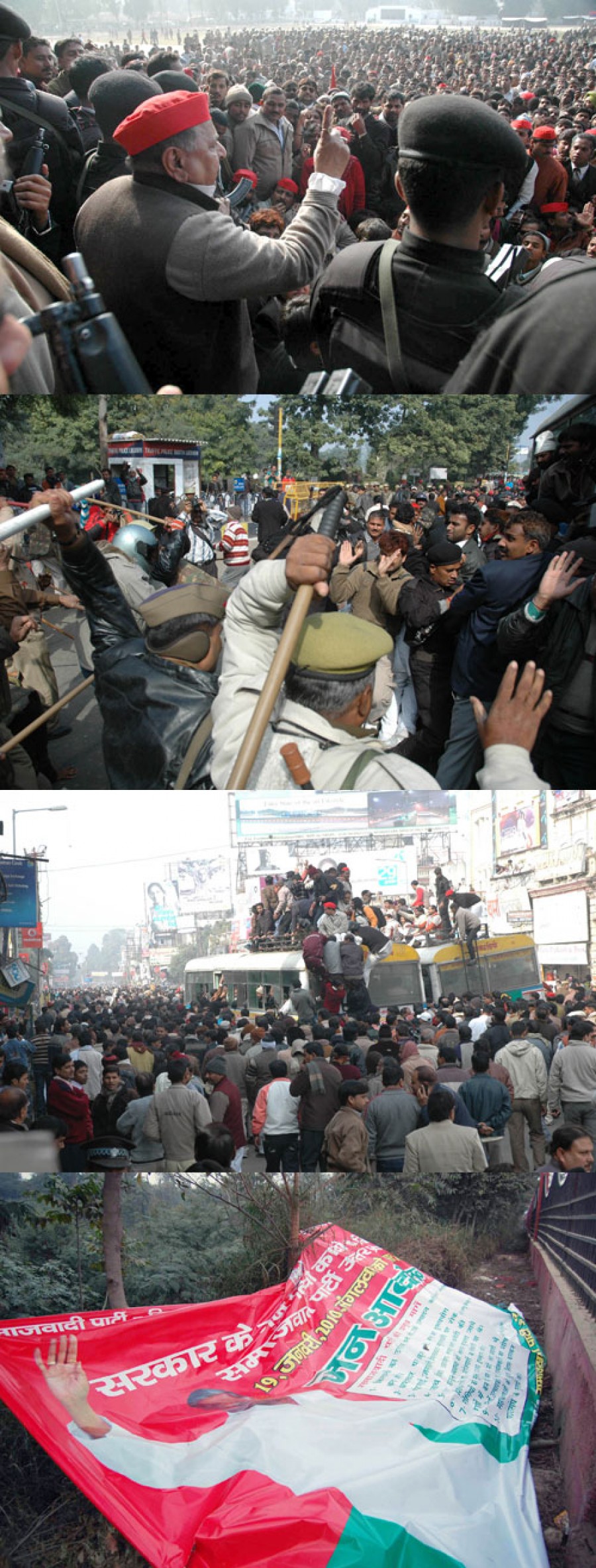 लखनऊ में मुलायम ने और कानपुर में सपा के प्रदेश अध्यक्ष अखिलेश यादव ने मोर्चा संभाल रखा था। दोनों जगह मायावती सरकार ने तगड़ी नाकेबंदी की थी लेकिन सपा के जबरदस्त विरोध के सामने प्रशासन को पसीने आ गए। कई जिलों में प्रदर्शन धरने और गिरफ्तारी से राज्य में कानून व्यवस्था को संभाल पाना प्रशासन के लिए मुश्किल हो गया। जिलों में सपा को धरना प्रदर्शन की अनुमति नहीं दी गई थी और धारा 144 लगाकर इसे निषिद्ध किया गया था, लेकिन सपा के अध्यक्ष मुलायम सिंह यादव ने एक दिन पहले ही कह दिया था कि सारे प्रतिबंध एवं बंधन तोड़कर इस सरकार के भ्रष्टाचार एवं घोर अत्याचार के खिलाफ सपा सड़कों पर उतरेगी। मुलायम के निशाने पर मायावती सरकार प्रमुखता से रही। मुलायम का आरोप है कि राज्य और केंद्र सरकार में नूरा कुश्ती हो रही है क्योंकि दोनों एक दूसरे से मिले हुए हैं।