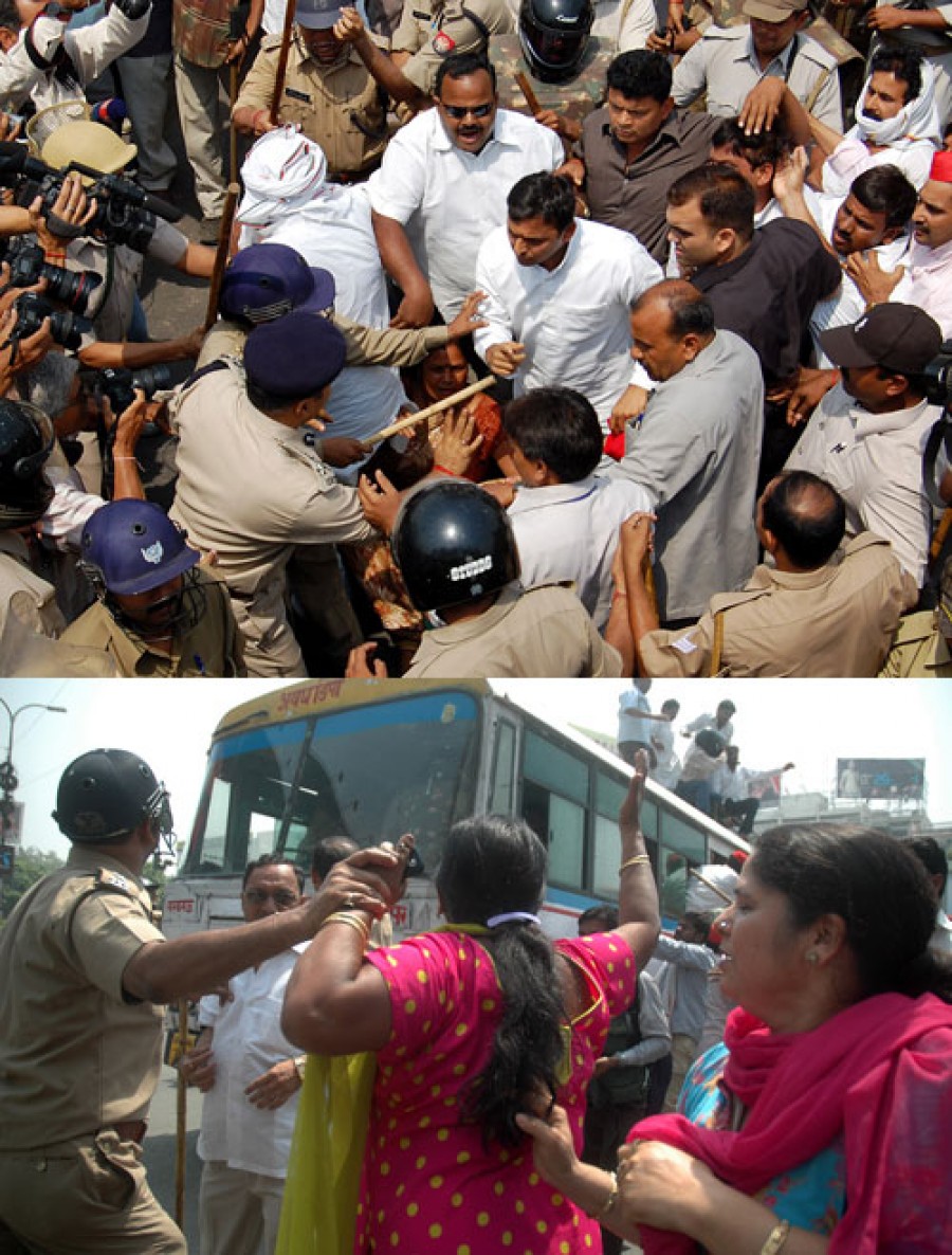 अखिलेश यादव के हजरतगंज पहुंचने पर वहां बड़ी तादाद में मौजूद पुलिस ने उन्हें घेरे में लिया। इस दौरान कुछ पुलिस अधिकारियों एवं सिपाहियों ने बहुत अभद्रता भी की। महिला पुलिस का कहीं पता भी नही था। पुरूष सिपाही, महिलाओं के साथ अभद्रता से भिड़े हुए थे। पुलिस ने कार्यकर्ताओं के पेट पीठ पर लाठी की चोट पहुंचाई। पुलिस लाठीचार्ज से कई घायल हो गए। लखनऊ में बड़ी तादाद में कार्यकर्ताओं को गिरफ्तार कर ले जाने में वाहनों की कमी पड़ने पर पुलिस लाश ढोने वाली गाड़ियों में भरकर ले गई।