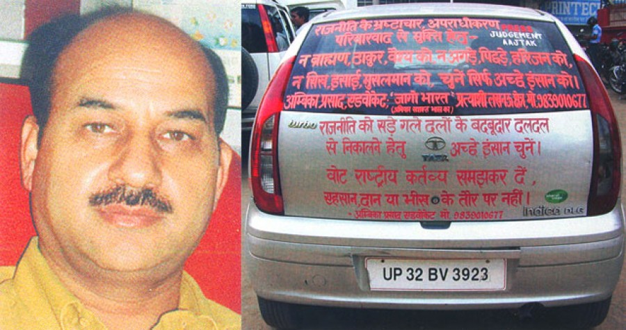 अंबिका प्रसाद भी लखनऊ लोकसभा क्षेत्र से अपनी किस्मत आजमा रहे हैं। वह निर्दलीय हैं और एक अनुभवी अधिवक्ता होने के साथ-साथ दर्शन राजनीतिक, सामाजिक मामलों पर मजबूत पकड़ रखते हैं। जागो भारत जैसे अभियान से प्रेरणा लेकर उन्होंने लखनऊ से अपना पर्चा भरा और वह अपना प्रचार कर रहे हैं। उनका कहना है कि भारत के विश्व के भ्रष्टम देशों में से एक होने के कलंक को धोने के लिए जागो भारत सामाजिक जन अभियान चला रहे हैं जिसका पहला लक्ष्य भारतीय राजनीति को प्राइवेट लिमिटेड कंपनी के चलाने के चलन को रोकना है जिसके कारण आज राजनीति में अच्छे चरित्रवान योग्य लोग राजनीति से दूर भाग रहे हैं और उनकी जगह माफिया सरगना हत्यारे और अन्य गंभीर आरोपों के गुनाहगार आ रहे हैं। इनके कारण राजनीति के इस शानदार उत्तरदान को ग्रहण लग रहा है। इस वक्त हर कोई मान कर बैठ गया है कि जो प्रत्याशी चुनाव मैदान में है उसमें समाज को दबाने, गुंडों को संरक्षण देने और भ्रष्ट तरीकों से धन अर्जित करने की खूबियां होंगी।