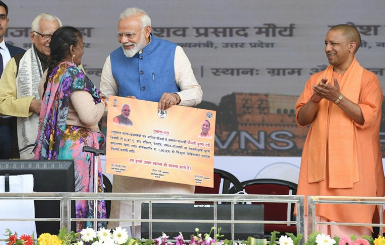 वाराणसी। प्रधानमंत्री नरेंद्र मोदी ने वाराणसी में विकास परियोजनाओं के अनावरण समारोह में विभिन्न योजनाओं के लाभार्थियों को प्रमाणपत्र वितरित किए। इस अवसर पर उत्तर प्रदेश के राज्यपाल राम नाईक और मुख्यमंत्री प्रदेश योगी आदित्यनाथ भी उपस्थित थे।