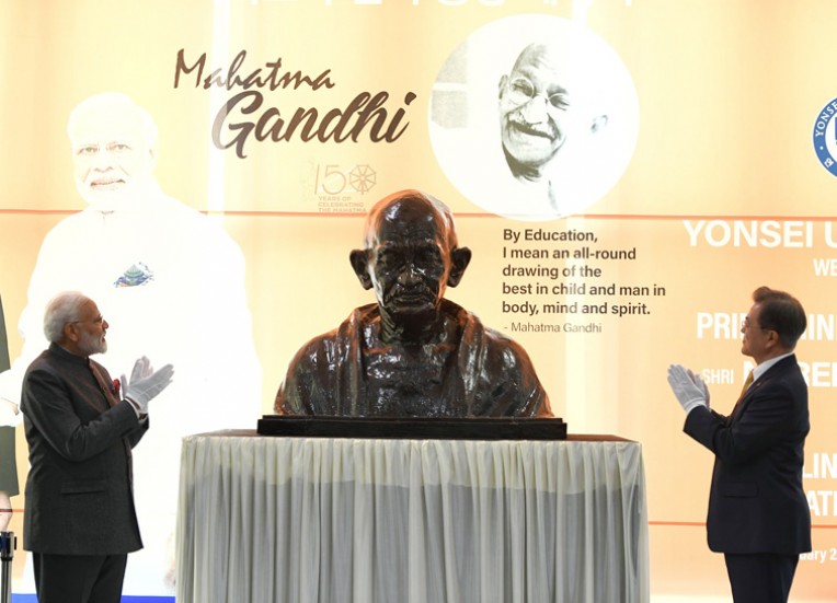 सियोल। प्रधानमंत्री नरेंद्र मोदी और दक्षिण कोरिया गणराज्य के राष्ट्रपति मून जे-इन ने 21 फरवरी 2019 को सियोल में योनेसी विश्वविद्यालय में महात्मा गांधी की प्रतिमा का अनावरण किया।