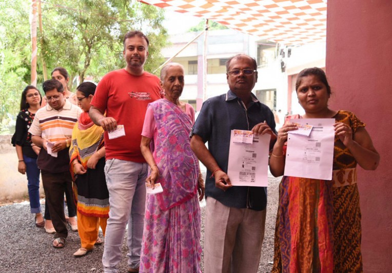सूरत। लोकसभा चुनाव-2019 के तीसरे चरण के दौरान 23 अप्रैल 2019 को गुजरात के शहर सूरत में मतदान केंद्र पर वोट डालने के लिए कतार में खड़े मतदाता।