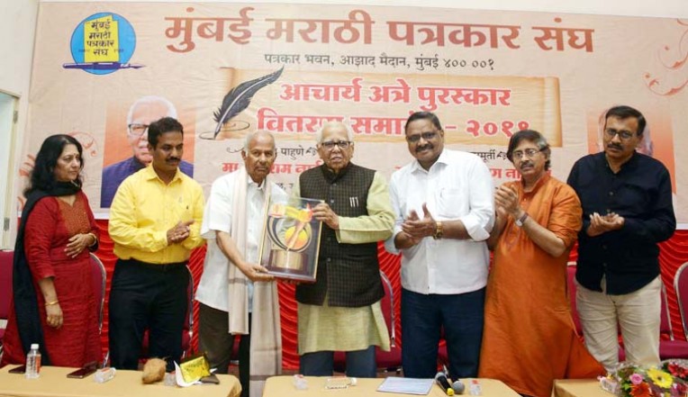 मुंबई। उत्तर प्रदेश के राज्यपाल रहे राम नाईक ने मुंबई मराठी पत्रकार संघ की ओर से आयोजित कार्यक्रम में वरिष्ठ पत्रकार (निवृत्त संपादक सकाळ) राधाकृष्ण नार्वेकर को आचार्य अत्रे पुरस्कार से सम्मानित किया। इस अवसर पर पत्रकार संघ के अधिकारी भी उपस्थित थे।