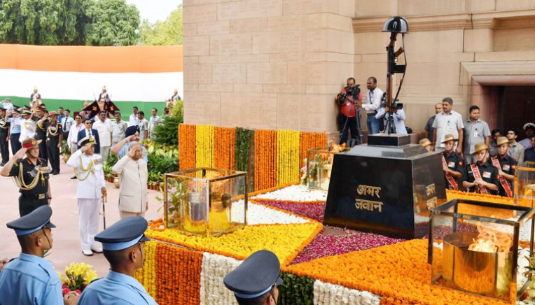 नई दिल्ली। राष्ट्रपति रामनाथ कोविंद ने 15 अगस्त 2018 को नई दिल्ली में 72वें स्वतंत्रता दिवस के अवसर पर देश की सेवा और सुरक्षा में अपने प्राणों की आहुति देने वाले वीर शहीदों को इंडिया गेट पर जाकर अमर जवान ज्योति पर श्रद्धांजलि अर्पित की। इस अवसर पर तीनों सेना प्रमुख एडमिरल सुनील लांबा, जनरल बिपिन रावत और एयर चीफ मार्शल बीएस धनोआ भी उपस्थित थे।