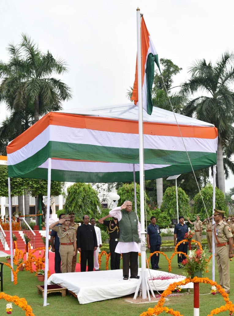 लखनऊ। उत्तर प्रदेश के राज्यपाल राम नाईक ने 72वें स्वतंत्रता दिवस पर राजभवन में झंडारोहण किया और पुलिस गार्ड की सलामी ली। इस अवसर पर राजभवन के अधिकारी, सुरक्षाकर्मी एवं कर्मचारी उपस्थित थे।